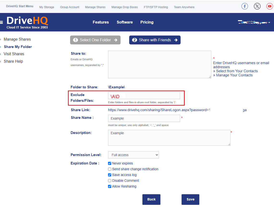 (2) When you share a folder, you can exclude or hide a subfolder(s). If you have already shared a folder, you can easily edit the share. Please see the screenshot below: (NOTE: you can only hide an immediate subfolder that is directly in Folder "\A".)